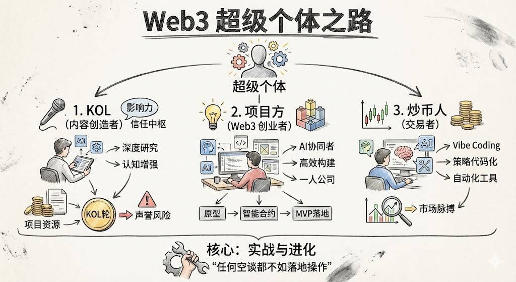 无论是哪条路径,实战都是关键,任何空谈都不如落地操作。超级个体需要的是「一个自我驱动的系统」。KOL 需要持续创作,创业者需要持续开发,交易员需要持续交易,每一步都以实践检验并进化。