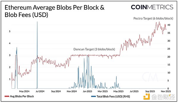 去年的Dencun升级引入了"Blob"——一种供Rollup在以太坊主网存储交易数据的高性价比方案。此后,得益于Base、Arbitrum和Lighter等Rollup的广泛采用,Blob使用率常接近饱和(当前接近每区块6个Blob的目标值),导致Rollup费用面临指数级飙升风险。数据可用性需求的增长使Blob空间成为以太坊扩容路径的关键瓶颈,而Fusaka升级正旨在突破此限制。