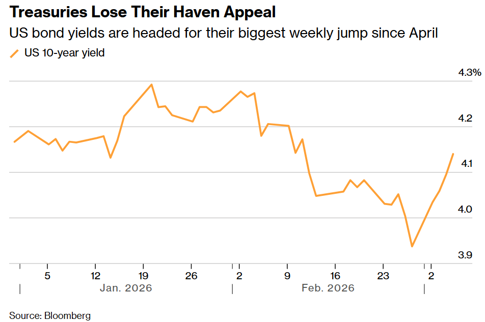 10年期美债收益率本周已飙升20个基点,料创下去年4月关税风波以来最大涨幅。这与上月创下一年来最大跌幅形成戏剧性反转。