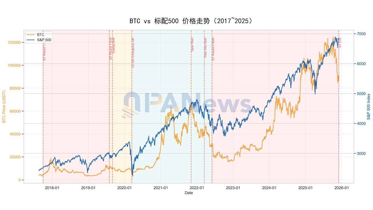 在行情走势上,存在着结果相似但过程大相径庭的区别。为了更清晰的看到这两次QT结束时的历史走势,PANew将2019年QT结束前2年的行情与2025年QT结束前的2年行情走势放到一个图中进行对比。当把价格的起点都归一化为100后,我们能够发现一个有趣的现象,即这两轮QT结束前的涨幅相当接近,2019年时为142%,如今为131%,也就是这两轮周期都上涨了约2.4倍。