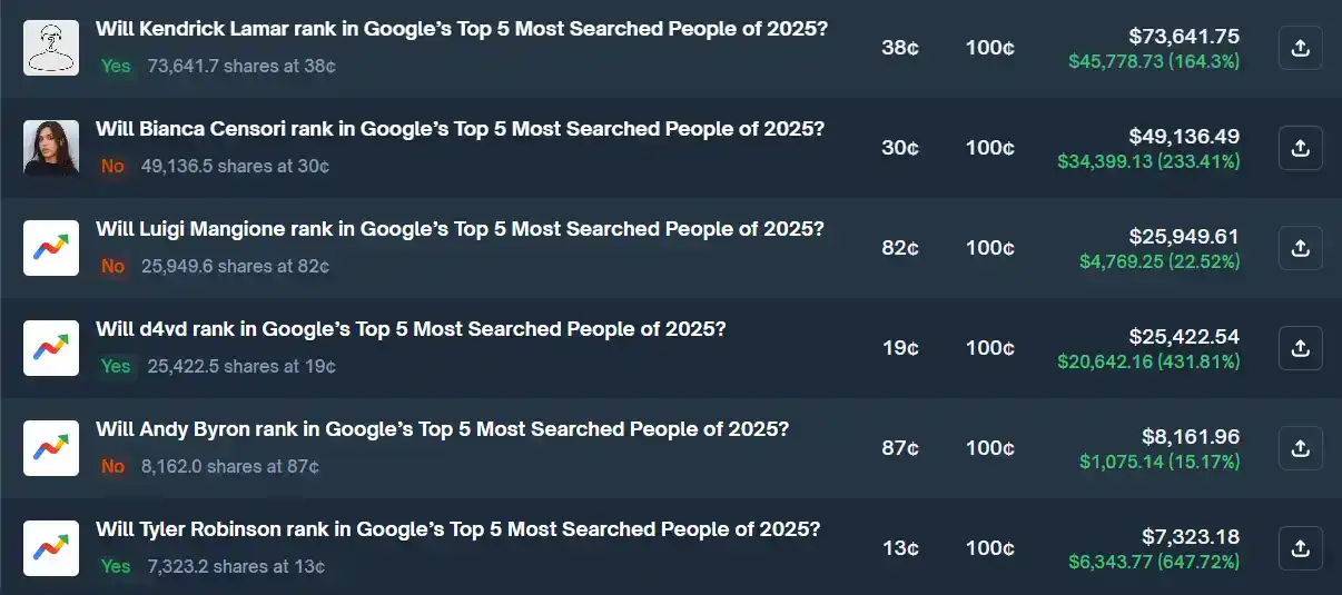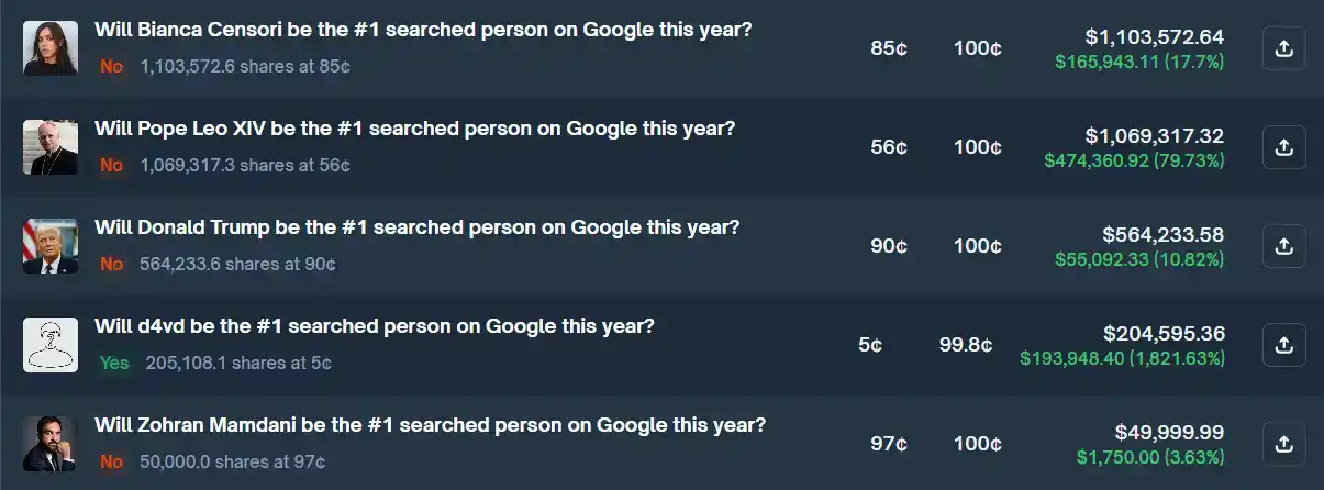 然而,就在他扫完单不到几个小时,谷歌突然发布了年度热搜榜单。当排名公布的一瞬间,整个市场都集体愣住了——榜首既不是教皇,也不是特朗普,更不是任何一个热门选项,而是那个长期概率接近零、交易员连资料都懒得查的名字:d4vd。