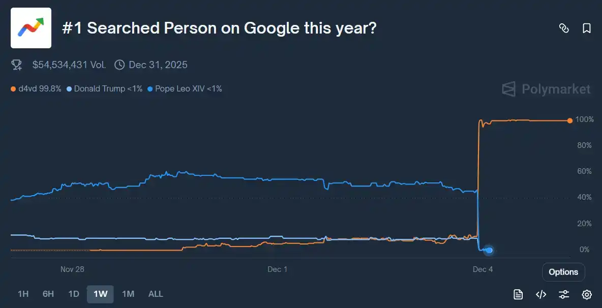 本周最火爆的 Polymarket 事件,莫过于昨日轰动全场的盘口「谁将成为 2025 年谷歌年度搜索排名第一的人物?」。自盘口开启以来,教皇利奥十四世一直稳居第一,概率长期稳定在 50% 左右;而特朗普、泰勒·斯威夫特、马斯克等全球知名人物,也占据着整个市场的叙事中心——这本应是一个由「名人之间」角逐的名单。