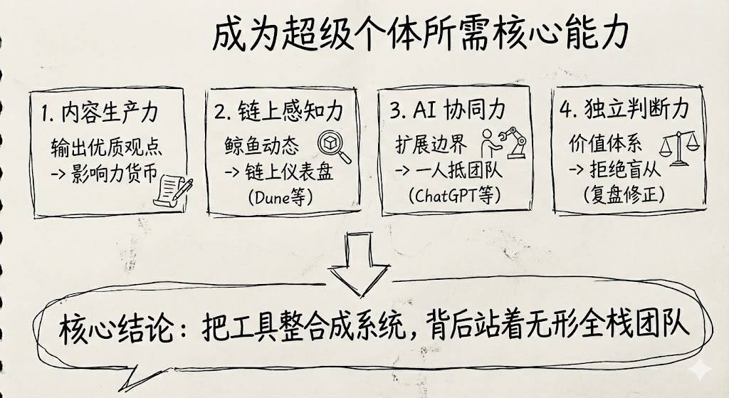 成为超级个体,需要多维能力的支撑,其中内容生产力、链上感知力、AI 协同力和独立判断力最为关键。