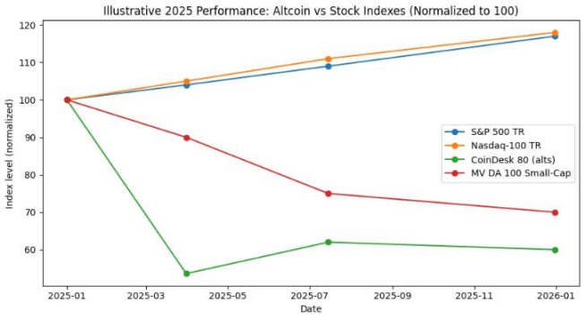 2025 年,标普 500 指数和纳斯达克 100 指数上涨了约 17%,而 CoinDesk 80 加密货币指数下跌了 40%,小市值加密货币下跌了 30%