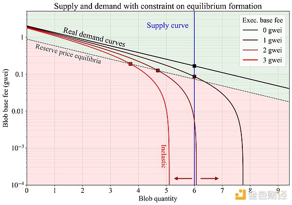 随着Blob容量的扩大,以太坊的Blob费用市场将在协调Rollup需求方面发挥更大作用。目前,Rollup在Blob上的花费微乎其微。由于需求对价格相对不敏感,且费用无法随使用量平滑调整,Blob费用常维持在1 wei的最低值。这导致费用机制处于"价格非弹性"区间,限制了其响应使用量变化的能力。