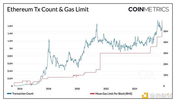 Fusaka升级同样高度重视L1扩容。通过EIP-7935提案,它将协议的默认Gas上限提升至6000万,显著增强了以太坊一层网络的执行能力。这一改进直接增加了单个区块可容纳的交易数量,从而实现更高吞吐量、降低网络拥堵并减少Gas费用。