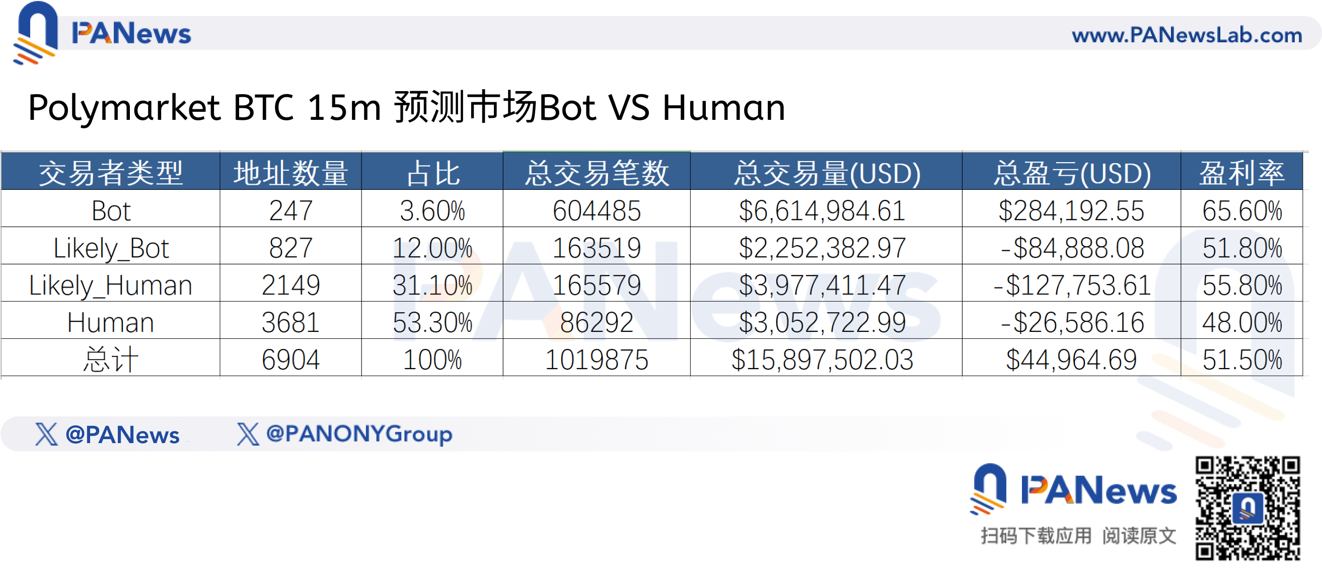 近日,PANews 分析团队对近期比特币15分钟涨跌预测市场进行了全量数据复盘。在涵盖约3天、291个短期市场、总计105万笔交易的庞大数据库中,我们看到的不止是冰冷的数字,而是一场算法与人性赤裸裸的博弈。