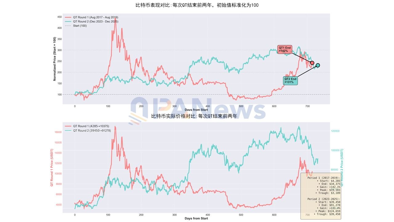 在行情走势上,存在着结果相似但过程大相径庭的区别。为了更清晰的看到这两次QT结束时的历史走势,PANew将2019年QT结束前2年的行情与2025年QT结束前的2年行情走势放到一个图中进行对比。当把价格的起点都归一化为100后,我们能够发现一个有趣的现象,即这两轮QT结束前的涨幅相当接近,2019年时为142%,如今为131%,也就是这两轮周期都上涨了约2.4倍。