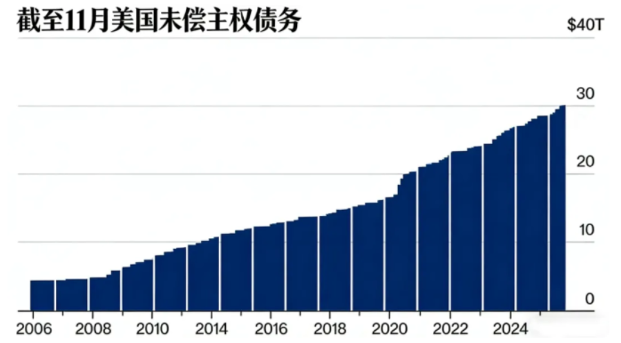 当30万亿美元的数字在2025年12月被正式确认时,可流通国债总额在七年间翻越至30.2万亿美元,其承载的“国家总债务”更是高达38.4万亿美元,正迅速接近41.1万亿美元的法定上限。